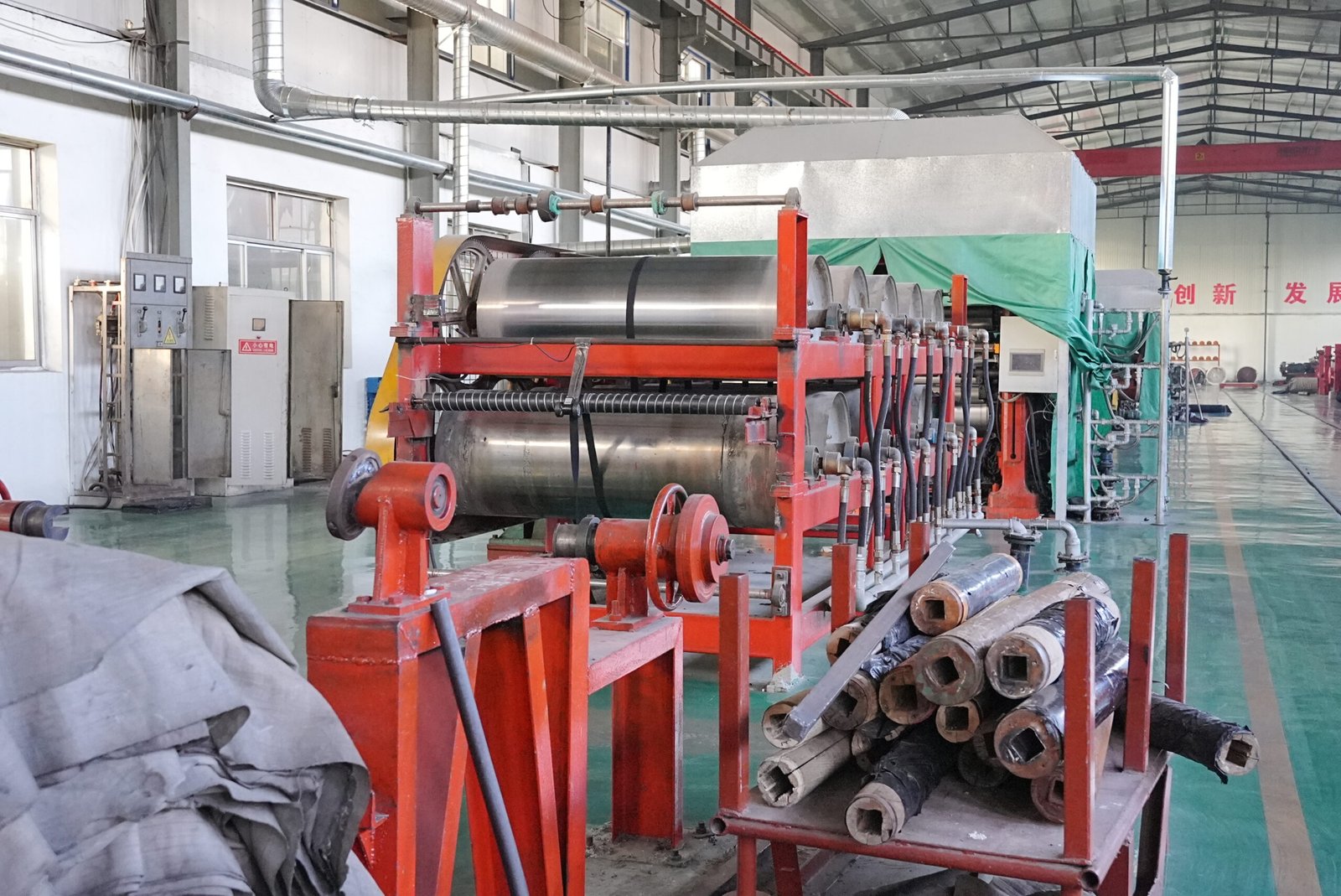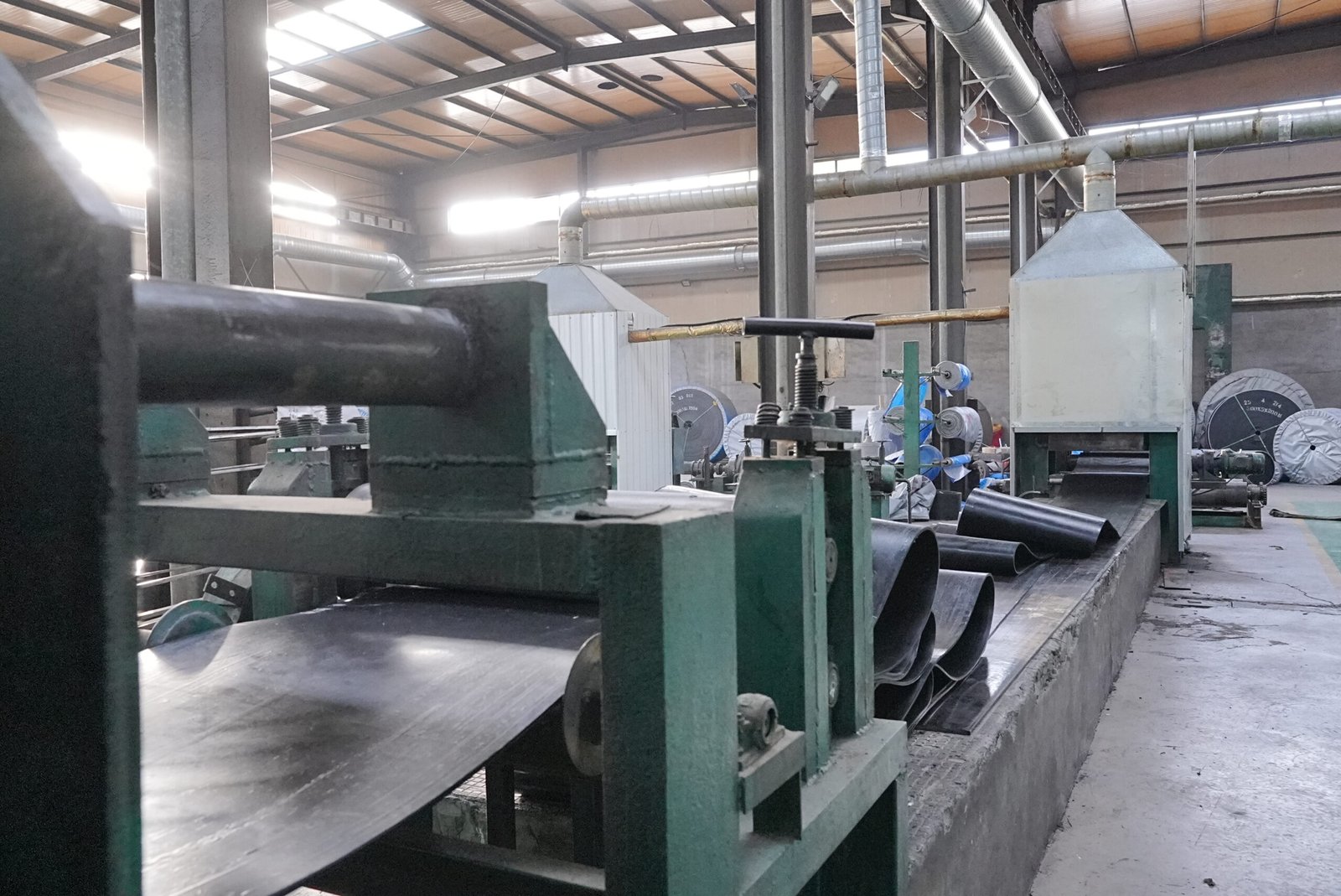This unit presses rubber into thin sheets with controlled thickness for belt production.