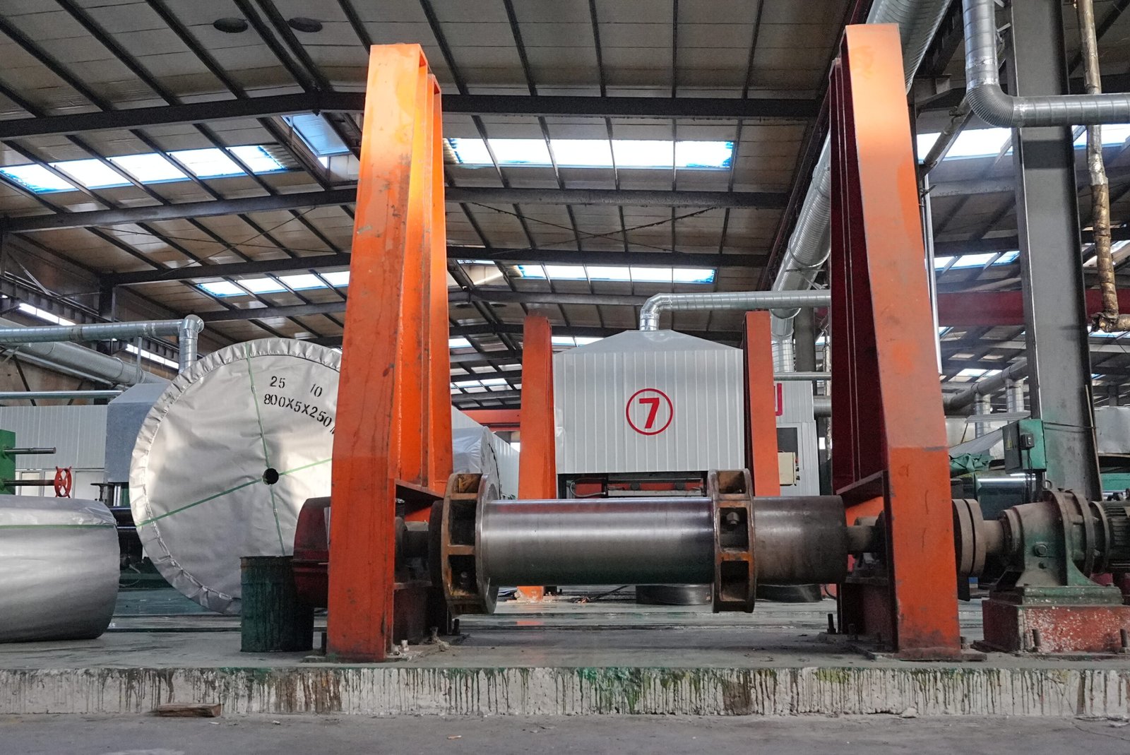 This machine laminates multiple fabric layers with rubber sheets to form the belt carcass.