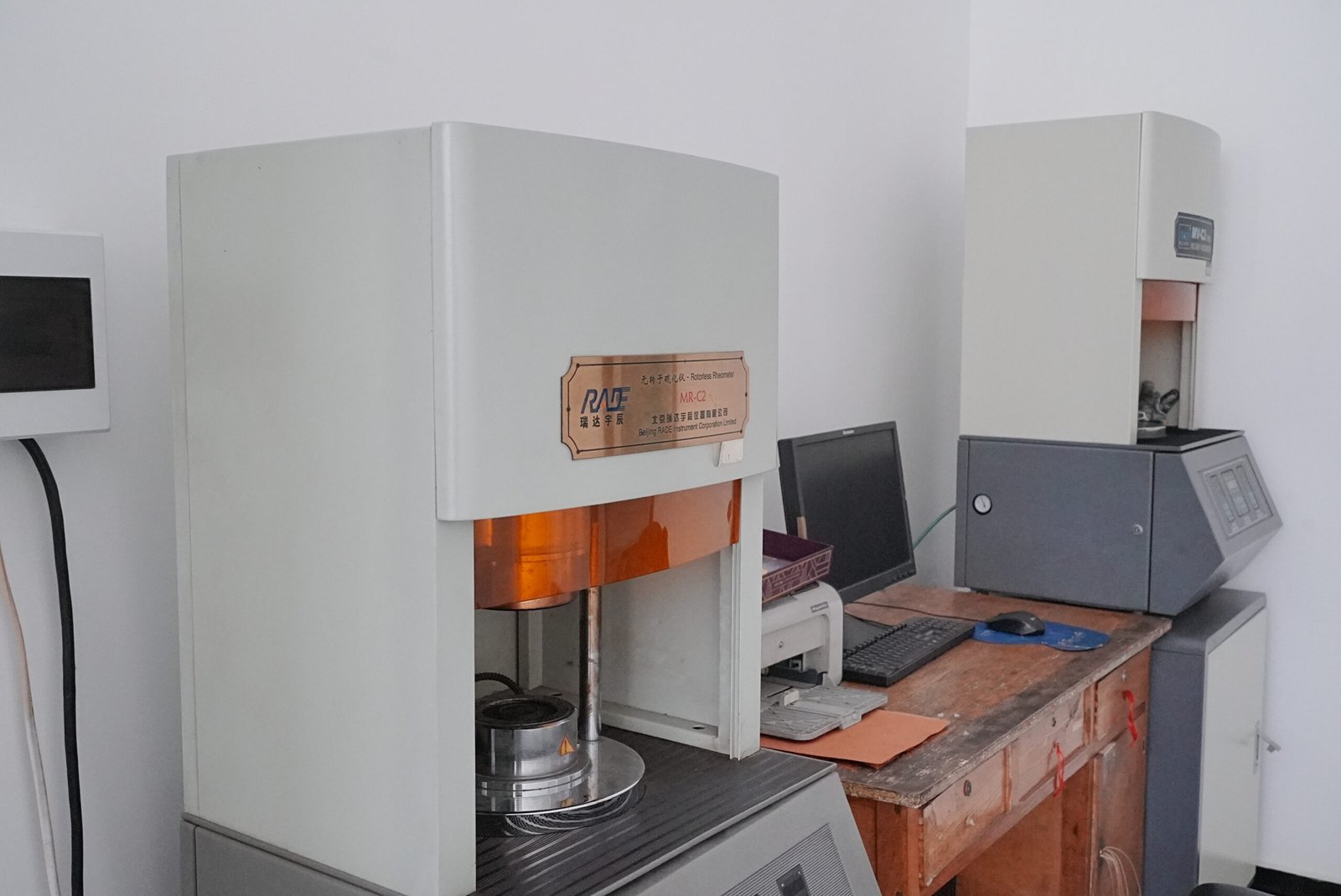 This high-precision scale weighs samples accurately to 0.0001g, used for density calculations, abrasion loss measurement, and compound formulation verification.